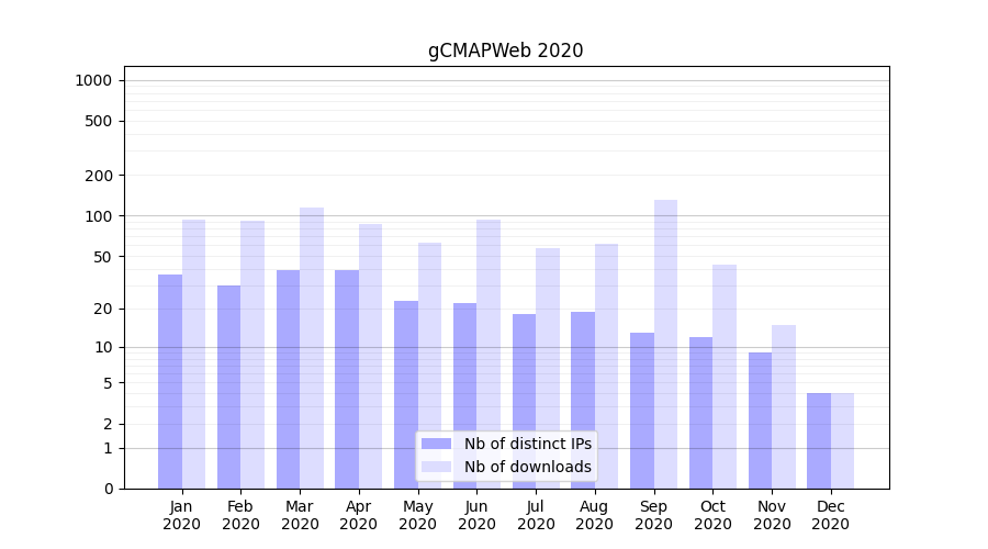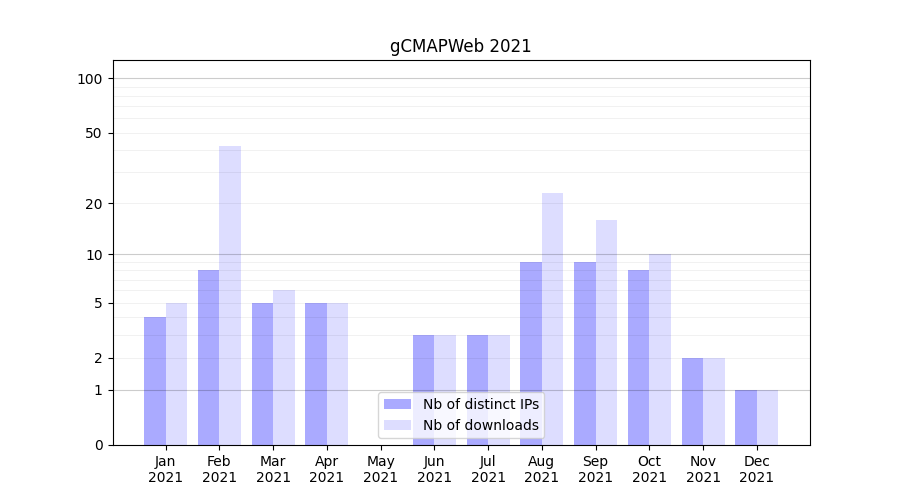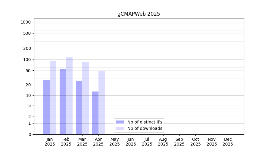 Number of downloads for software package gCMAPWeb, year by year, from 2025 back to 2014 (years with no downloads are omitted):