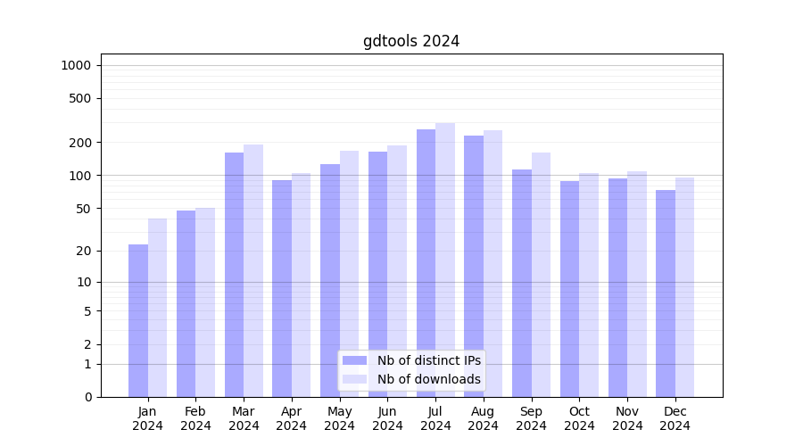 Number of downloads for software package gdtools, year by year, from 2025 back to 2014 (years with no downloads are omitted):