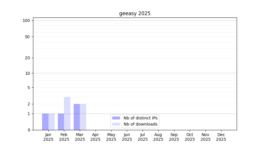 Number of downloads for software package geeasy, year by year, from 2025 back to 2014 (years with no downloads are omitted):