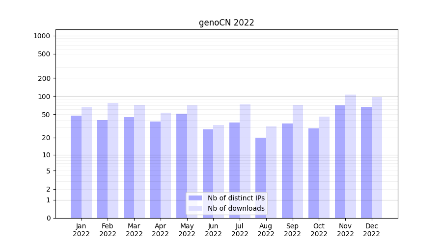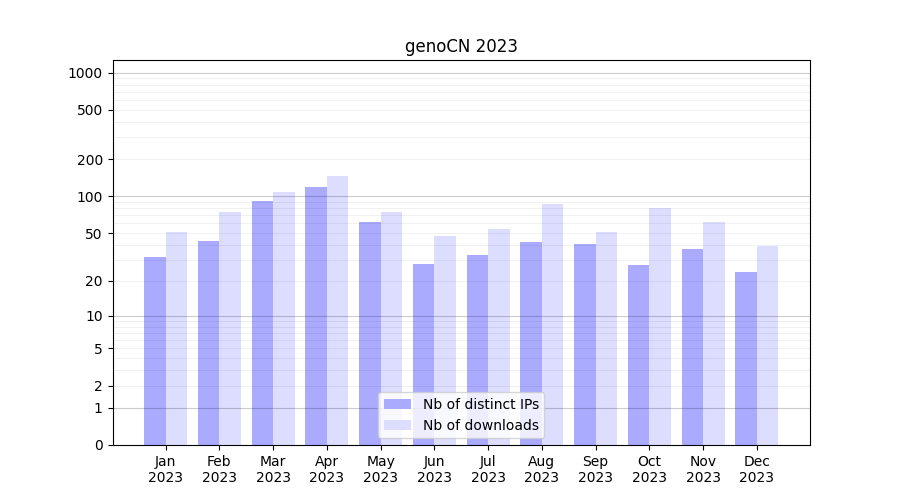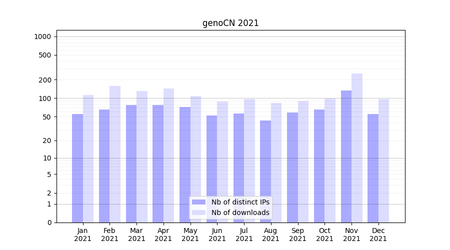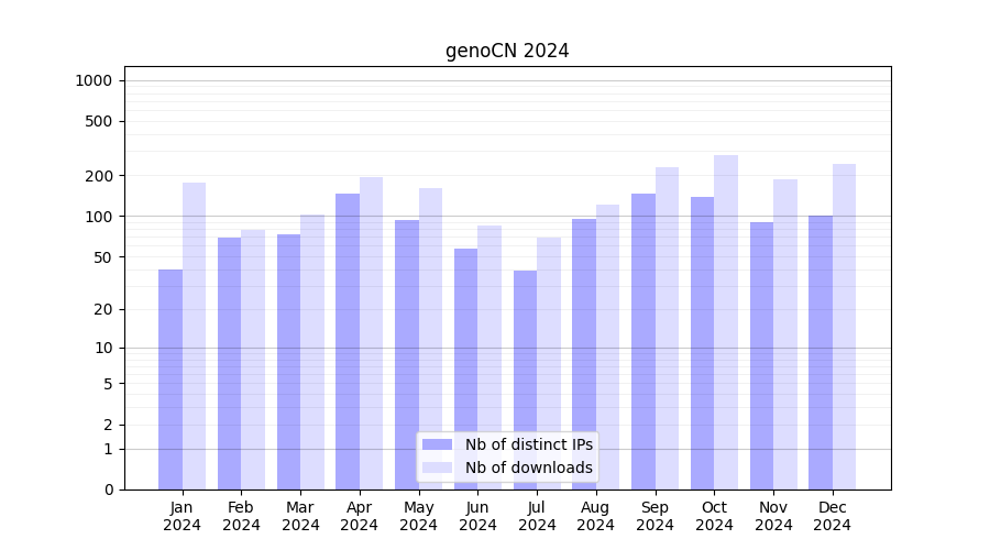 Number of downloads for software package genoCN, year by year, from 2025 back to 2014 (years with no downloads are omitted):