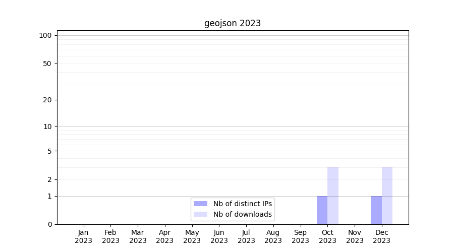 Number of downloads for software package geojson, year by year, from 2025 back to 2014 (years with no downloads are omitted):