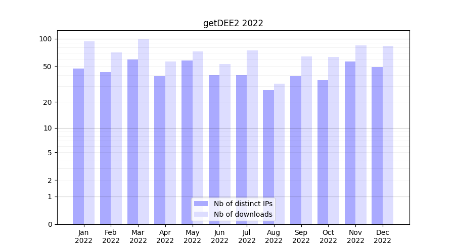 Number of downloads for software package getDEE2, year by year, from 2025 back to 2014 (years with no downloads are omitted):