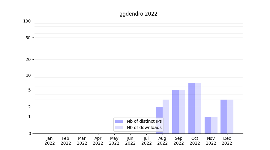 Number of downloads for software package ggdendro, year by year, from 2025 back to 2014 (years with no downloads are omitted):