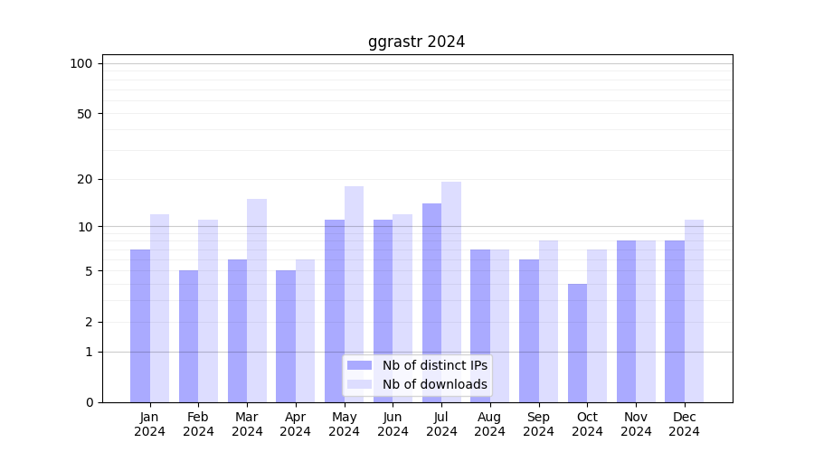 Number of downloads for software package ggrastr, year by year, from 2025 back to 2014 (years with no downloads are omitted):