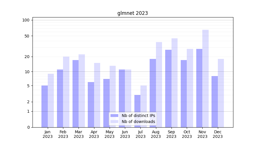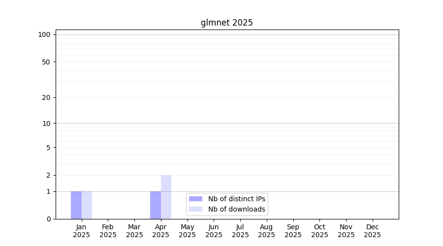 Number of downloads for software package glmnet, year by year, from 2025 back to 2014 (years with no downloads are omitted):