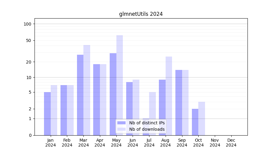 Number of downloads for software package glmnetUtils, year by year, from 2025 back to 2014 (years with no downloads are omitted):