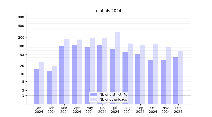 Number of downloads for software package globals, year by year, from 2025 back to 2014 (years with no downloads are omitted):