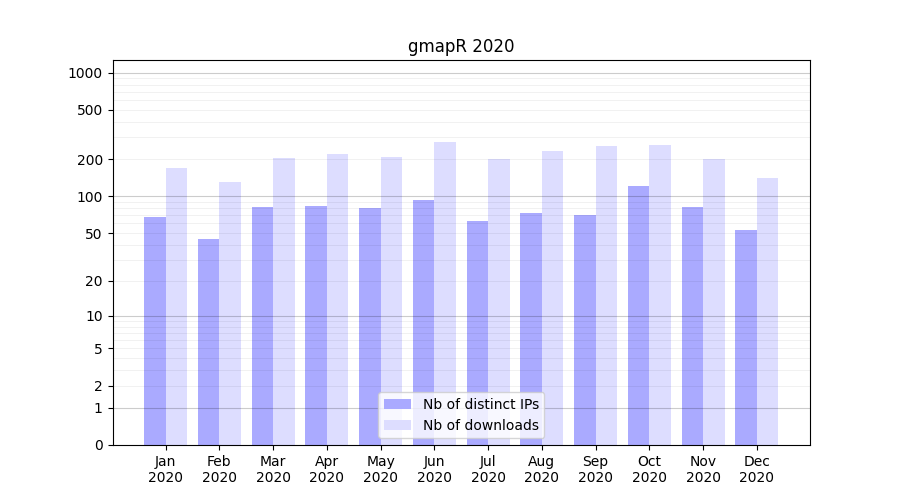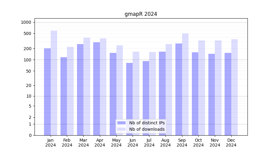 Number of downloads for software package gmapR, year by year, from 2025 back to 2014 (years with no downloads are omitted):