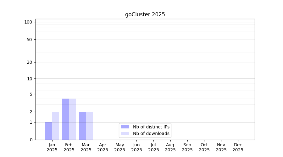Number of downloads for software package goCluster, year by year, from 2025 back to 2014 (years with no downloads are omitted):