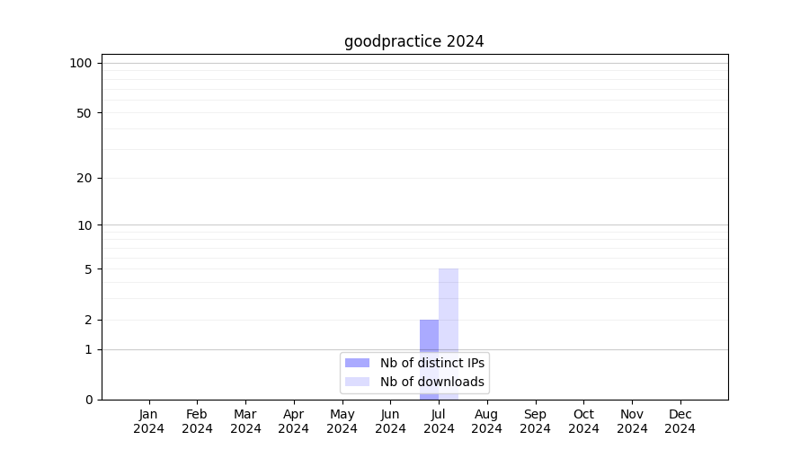 Number of downloads for software package goodpractice, year by year, from 2025 back to 2014 (years with no downloads are omitted):