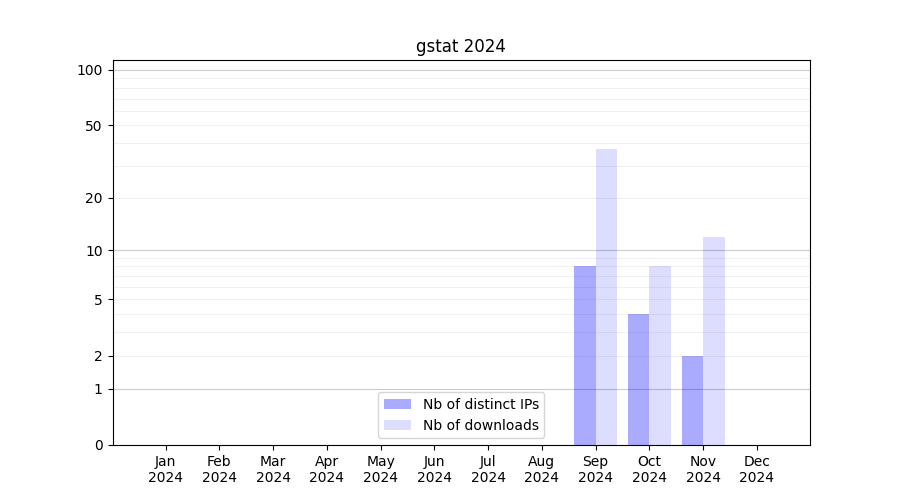 Number of downloads for software package gstat, year by year, from 2025 back to 2014 (years with no downloads are omitted):