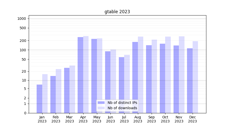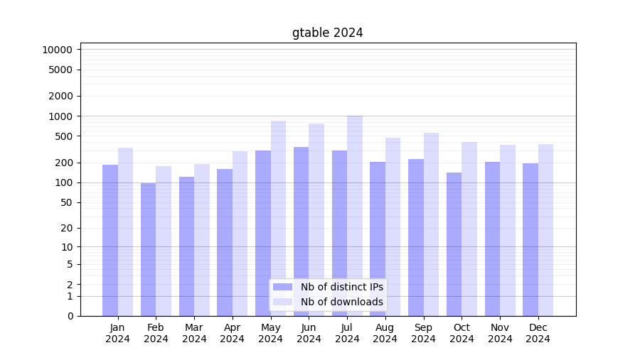 Number of downloads for software package gtable, year by year, from 2025 back to 2014 (years with no downloads are omitted):