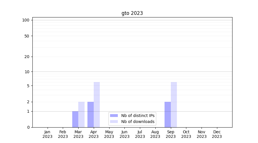 Number of downloads for software package gto, year by year, from 2025 back to 2014 (years with no downloads are omitted):
