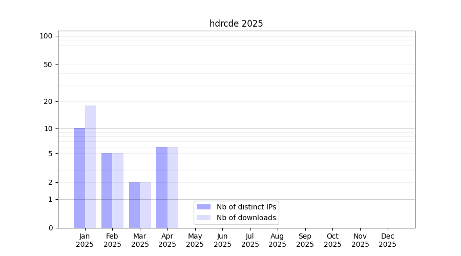 Number of downloads for software package hdrcde, year by year, from 2025 back to 2014 (years with no downloads are omitted):
