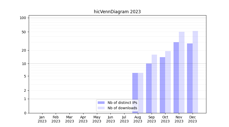 Number of downloads for software package hicVennDiagram, year by year, from 2025 back to 2014 (years with no downloads are omitted):