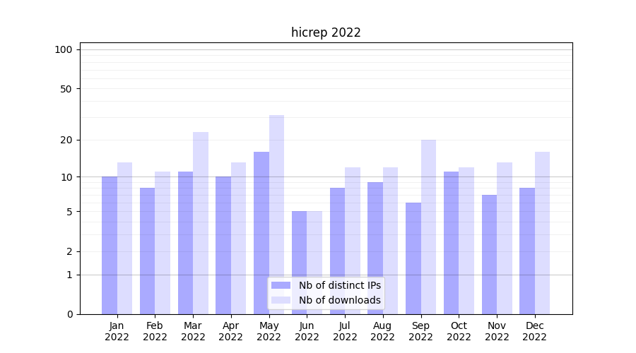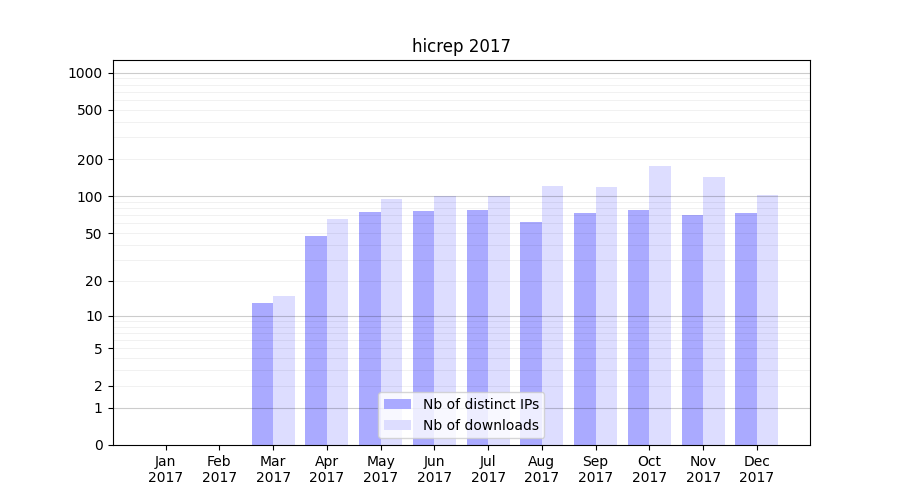 Number of downloads for software package hicrep, year by year, from 2025 back to 2014 (years with no downloads are omitted):