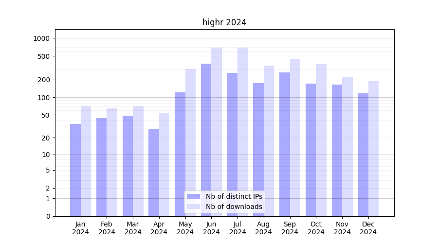 Number of downloads for software package highr, year by year, from 2025 back to 2014 (years with no downloads are omitted):