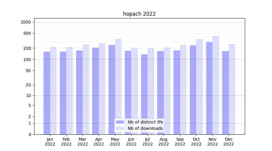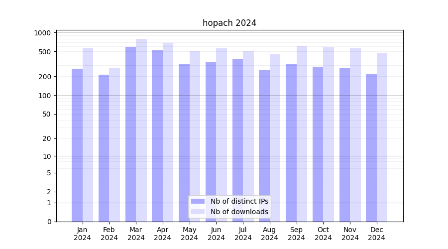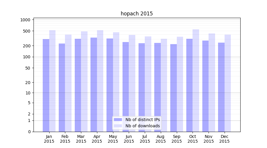 Number of downloads for software package hopach, year by year, from 2025 back to 2014 (years with no downloads are omitted):