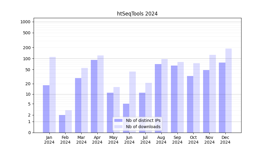 Number of downloads for software package htSeqTools, year by year, from 2025 back to 2014 (years with no downloads are omitted):