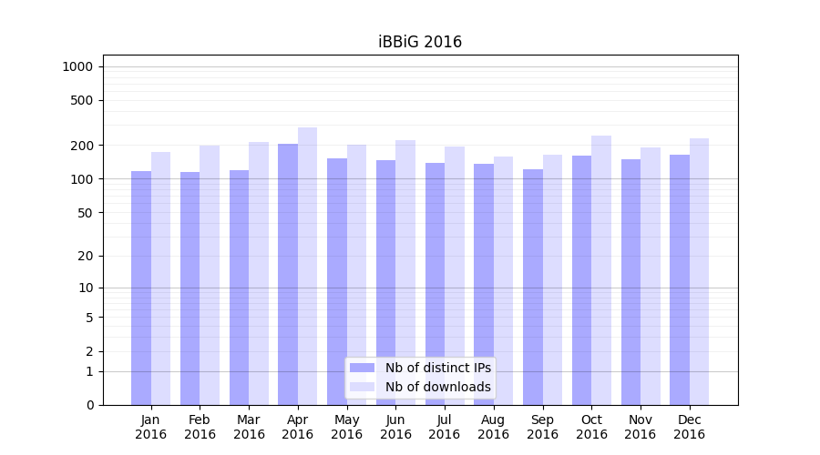 Number of downloads for software package iBBiG, year by year, from 2025 back to 2014 (years with no downloads are omitted):