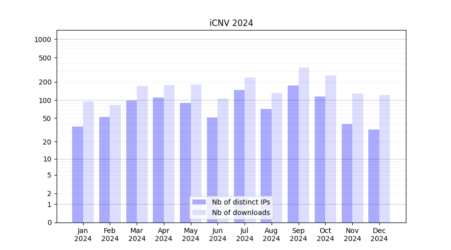 Number of downloads for software package iCNV, year by year, from 2025 back to 2014 (years with no downloads are omitted):