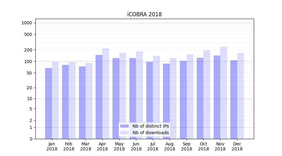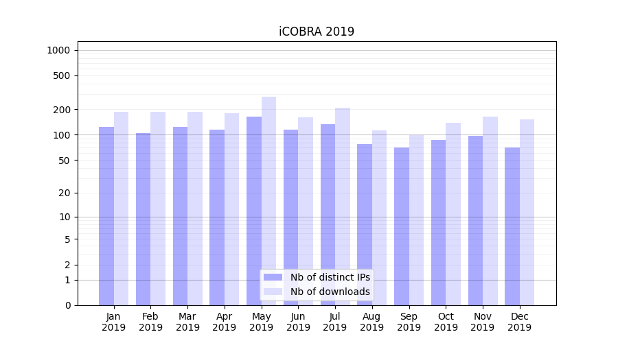 Number of downloads for software package iCOBRA, year by year, from 2025 back to 2014 (years with no downloads are omitted):