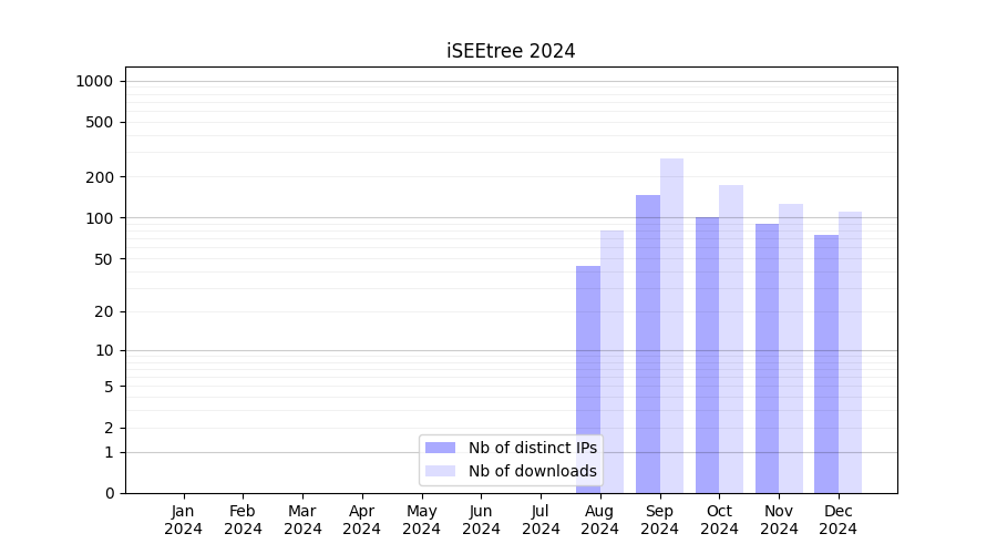 Number of downloads for software package iSEEtree, year by year, from 2025 back to 2014 (years with no downloads are omitted):