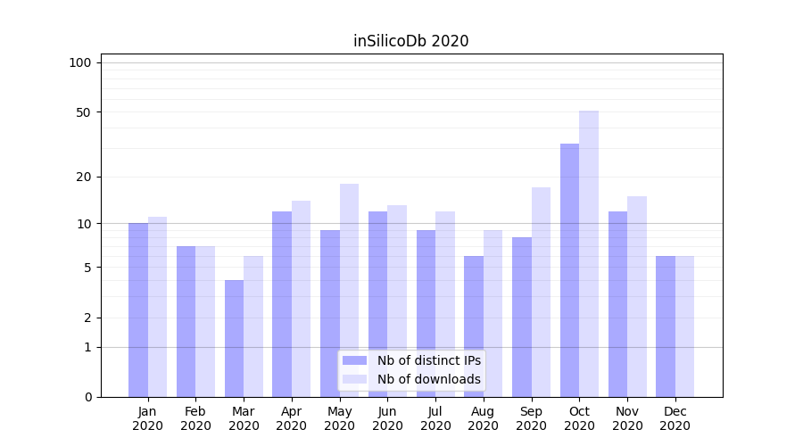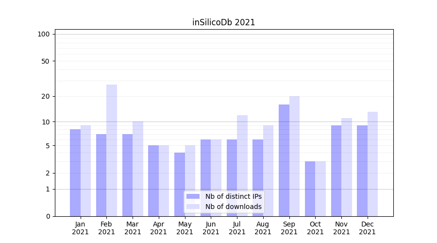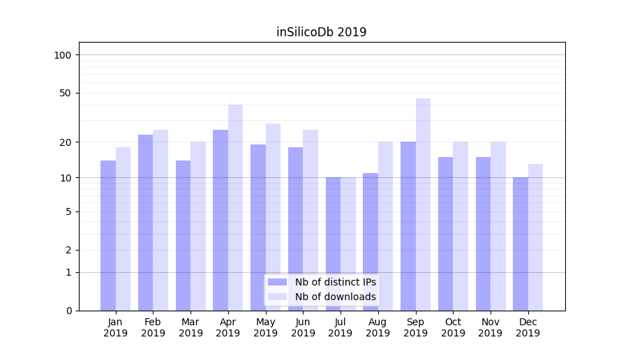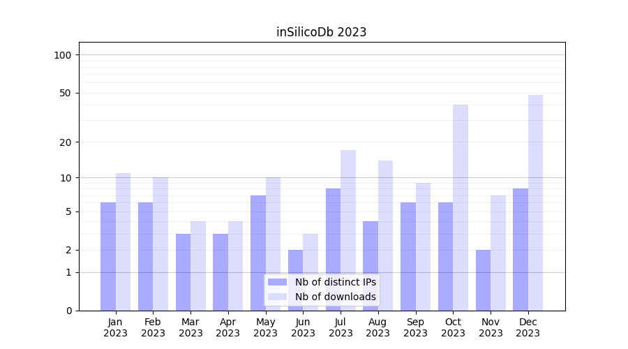 Number of downloads for software package inSilicoDb, year by year, from 2025 back to 2014 (years with no downloads are omitted):