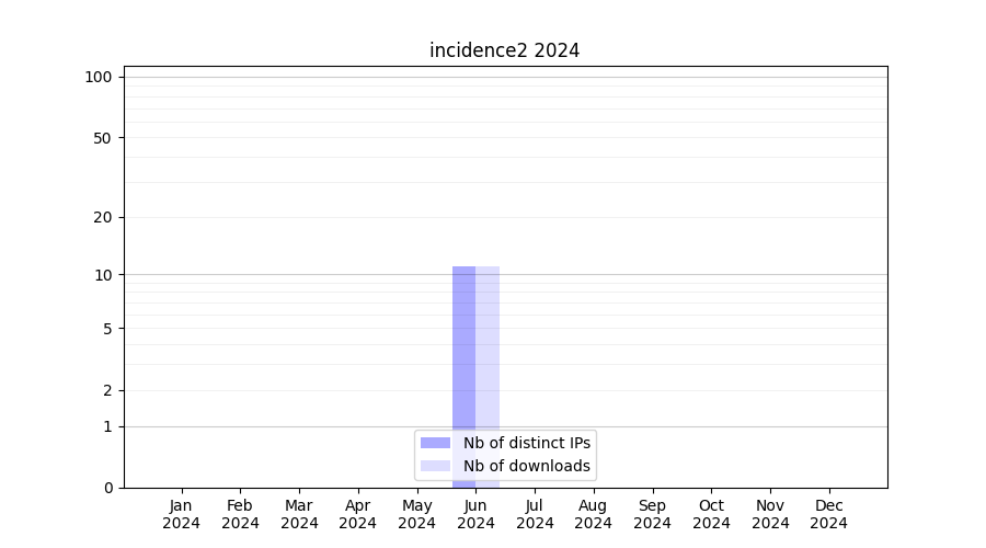 Number of downloads for software package incidence2, year by year, from 2025 back to 2014 (years with no downloads are omitted):