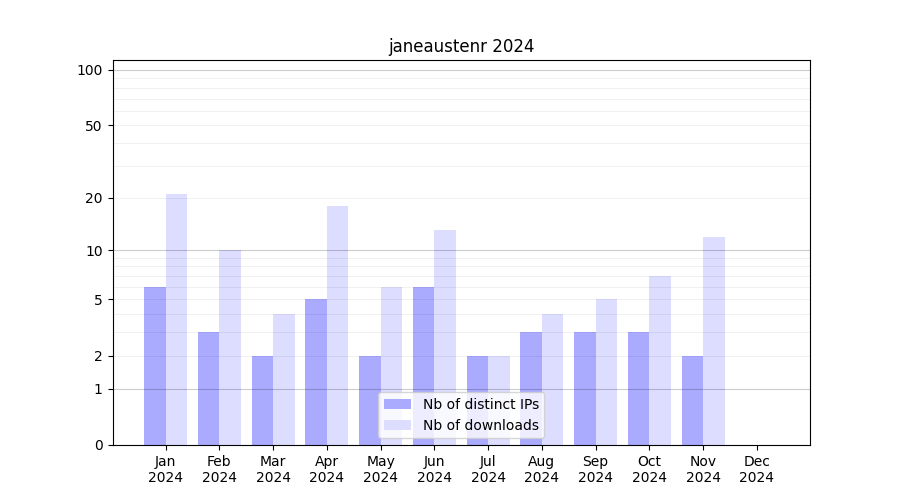 Number of downloads for software package janeaustenr, year by year, from 2025 back to 2014 (years with no downloads are omitted):