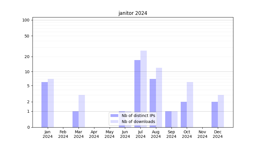 Number of downloads for software package janitor, year by year, from 2025 back to 2014 (years with no downloads are omitted):