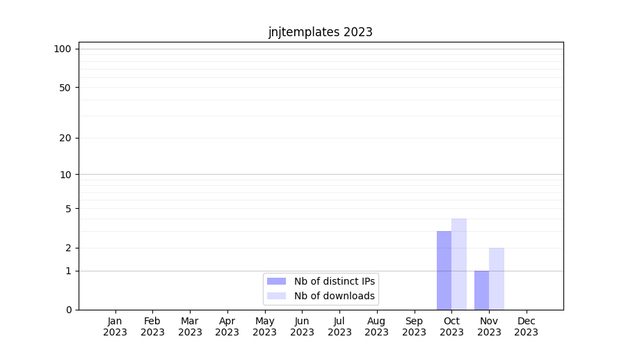 Number of downloads for software package jnjtemplates, year by year, from 2025 back to 2014 (years with no downloads are omitted):