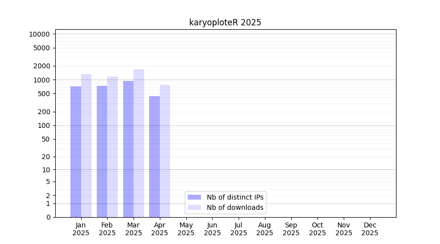 Number of downloads for software package karyoploteR, year by year, from 2025 back to 2014 (years with no downloads are omitted):