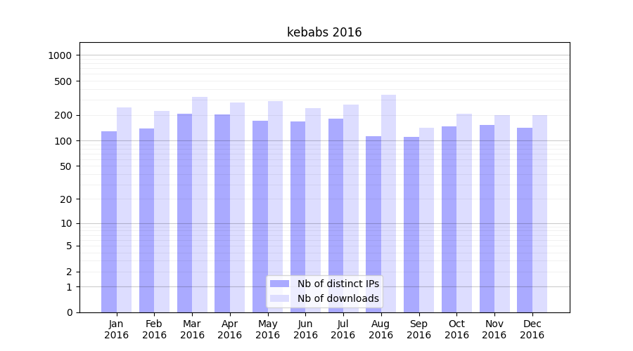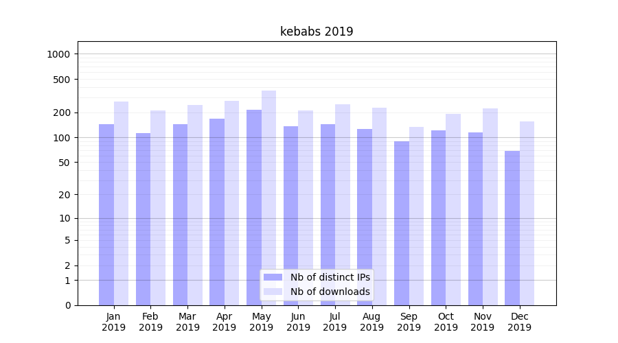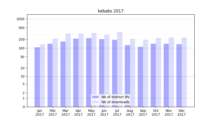 Number of downloads for software package kebabs, year by year, from 2025 back to 2014 (years with no downloads are omitted):