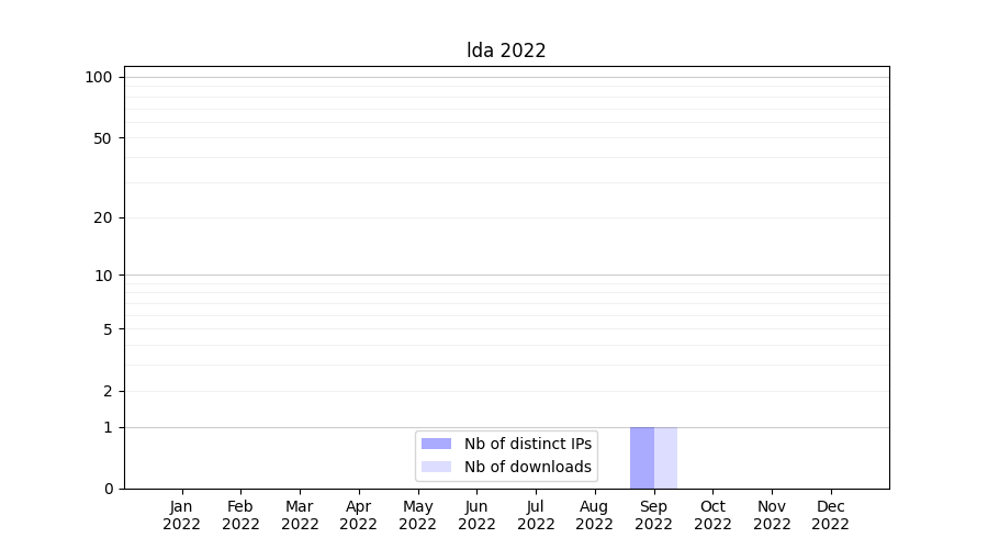 Number of downloads for software package lda, year by year, from 2025 back to 2014 (years with no downloads are omitted):