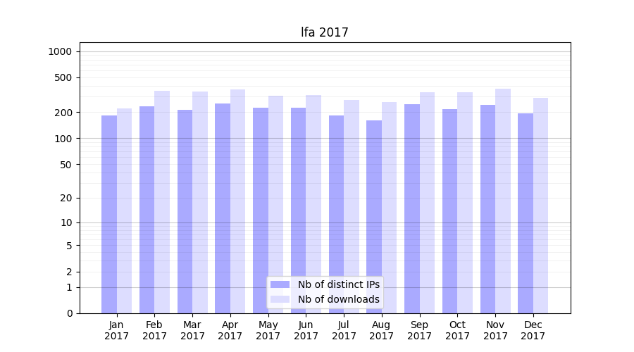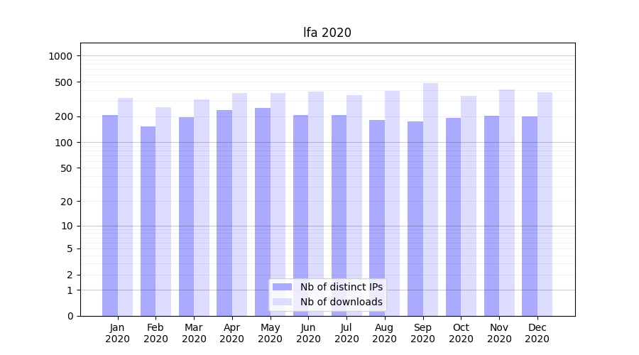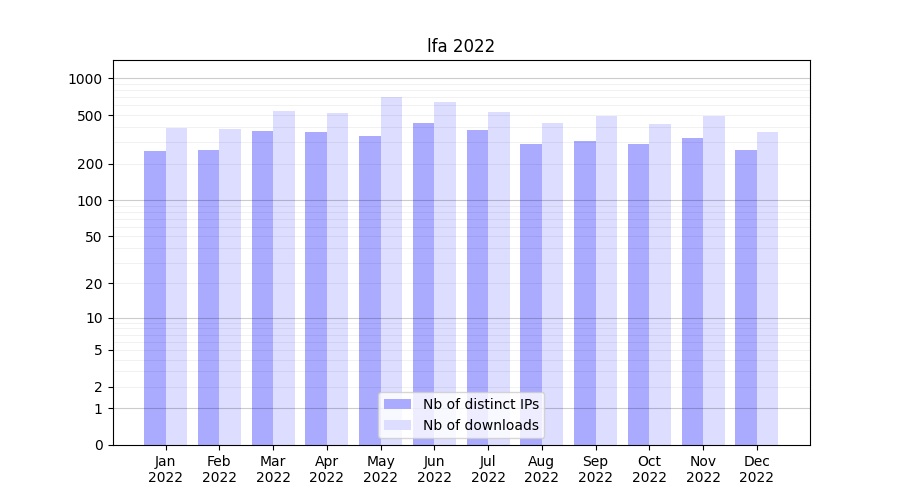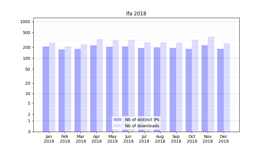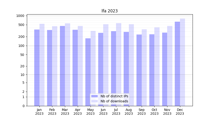 Number of downloads for software package lfa, year by year, from 2025 back to 2014 (years with no downloads are omitted):