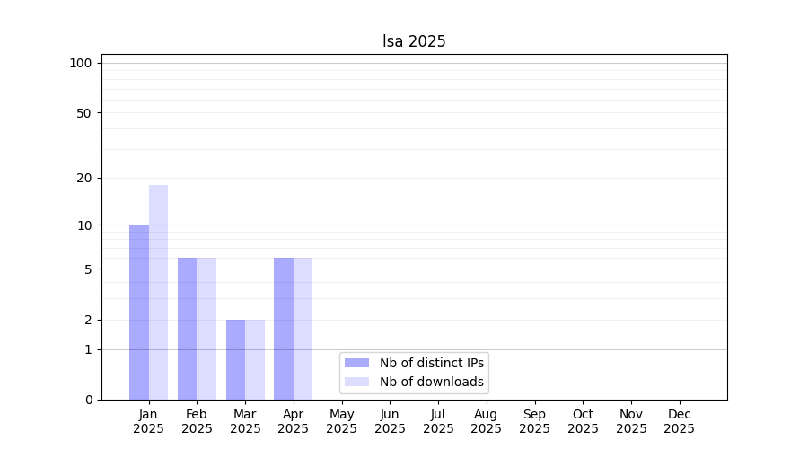 Number of downloads for software package lsa, year by year, from 2025 back to 2014 (years with no downloads are omitted):