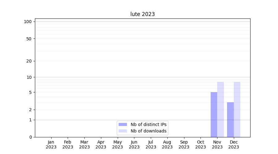 Number of downloads for software package lute, year by year, from 2025 back to 2014 (years with no downloads are omitted):