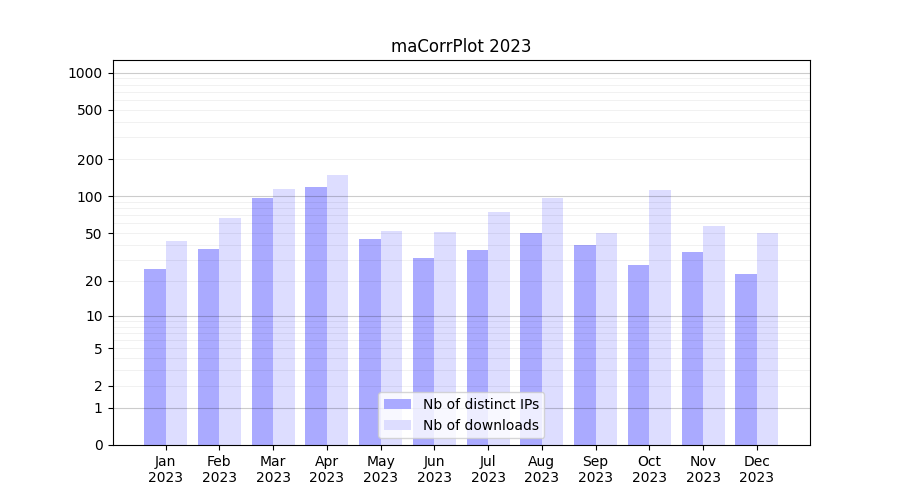Number of downloads for software package maCorrPlot, year by year, from 2025 back to 2014 (years with no downloads are omitted):