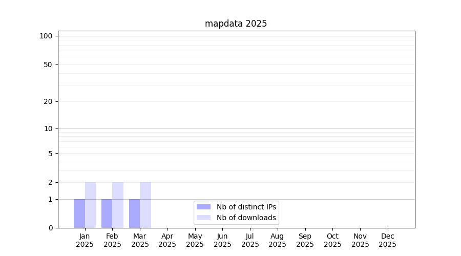 Number of downloads for software package mapdata, year by year, from 2025 back to 2014 (years with no downloads are omitted):