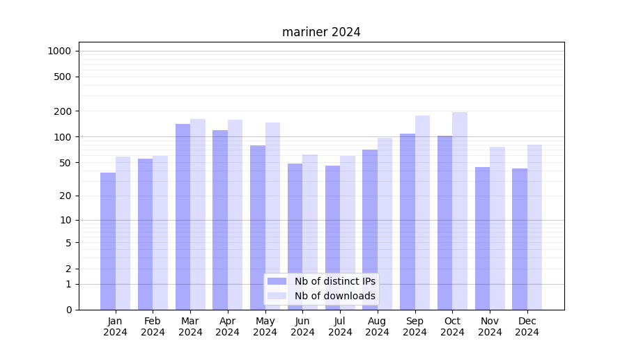 Number of downloads for software package mariner, year by year, from 2025 back to 2014 (years with no downloads are omitted):