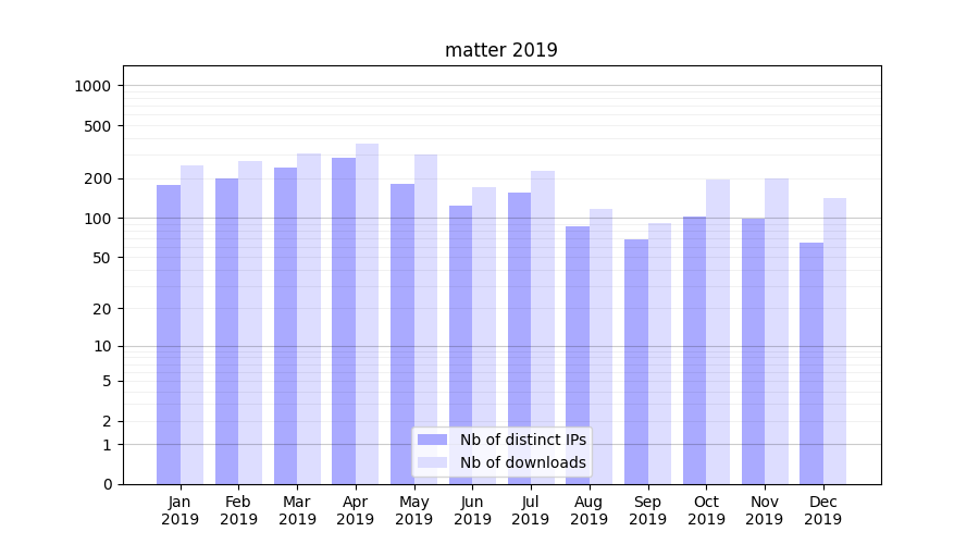 Number of downloads for software package matter, year by year, from 2025 back to 2014 (years with no downloads are omitted):