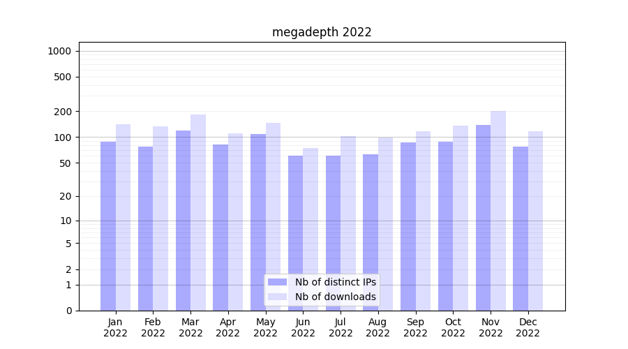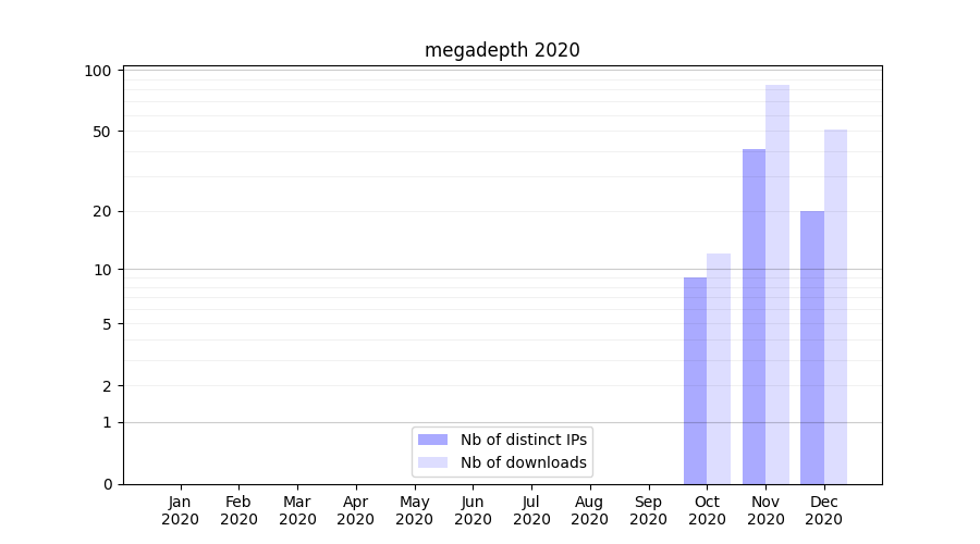 Number of downloads for software package megadepth, year by year, from 2025 back to 2014 (years with no downloads are omitted):