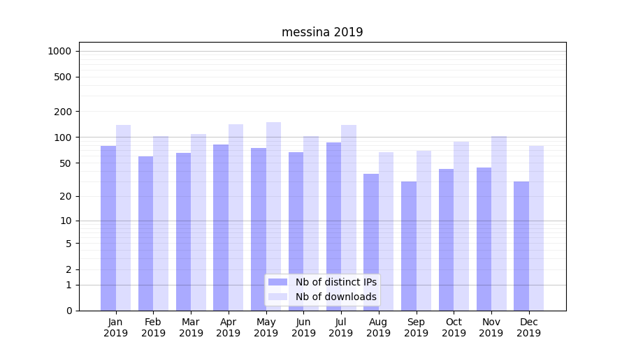 Number of downloads for software package messina, year by year, from 2025 back to 2014 (years with no downloads are omitted):