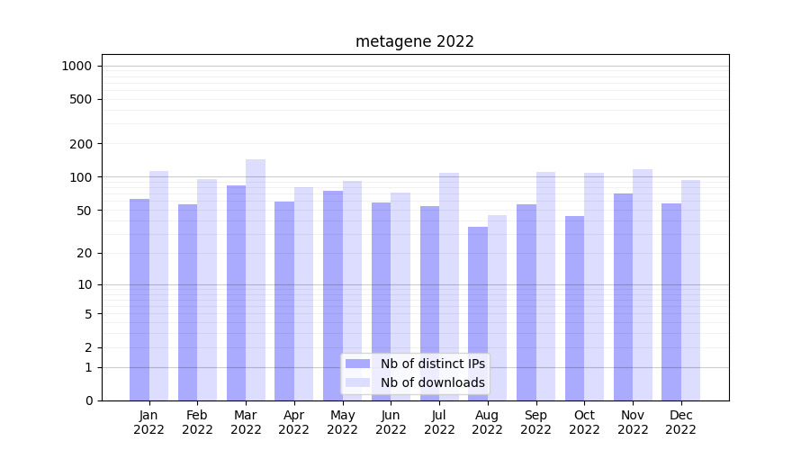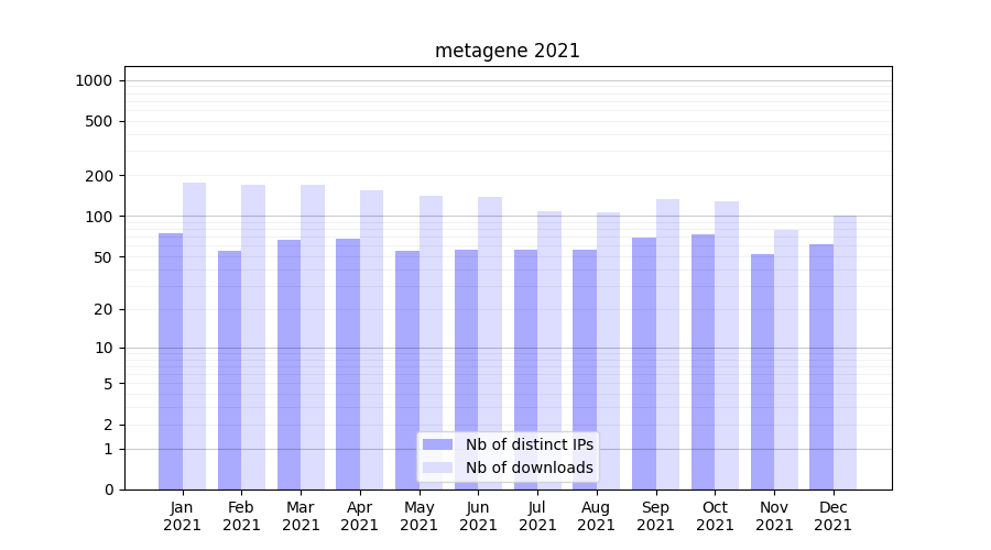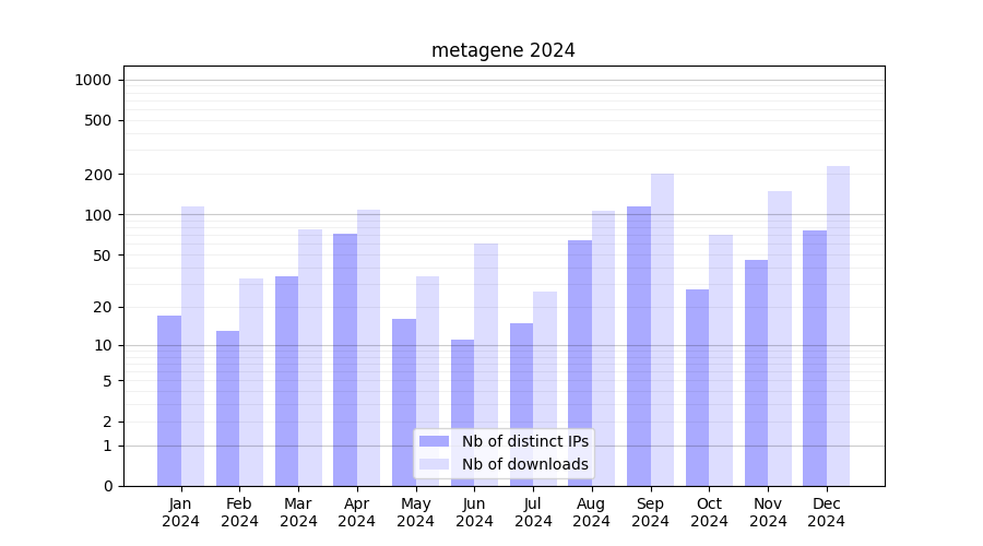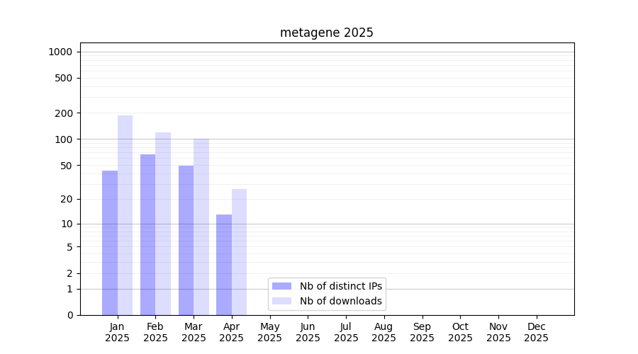Number of downloads for software package metagene, year by year, from 2025 back to 2014 (years with no downloads are omitted):