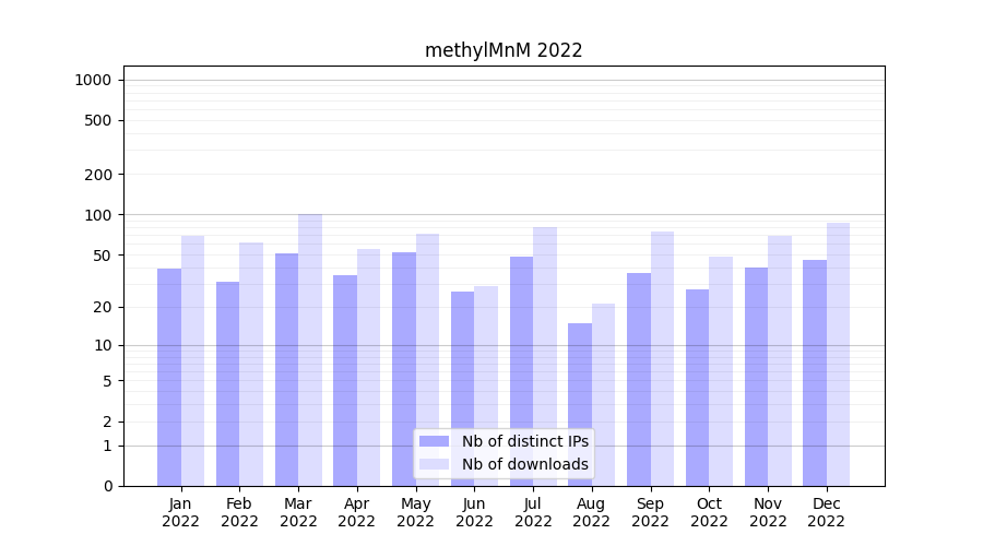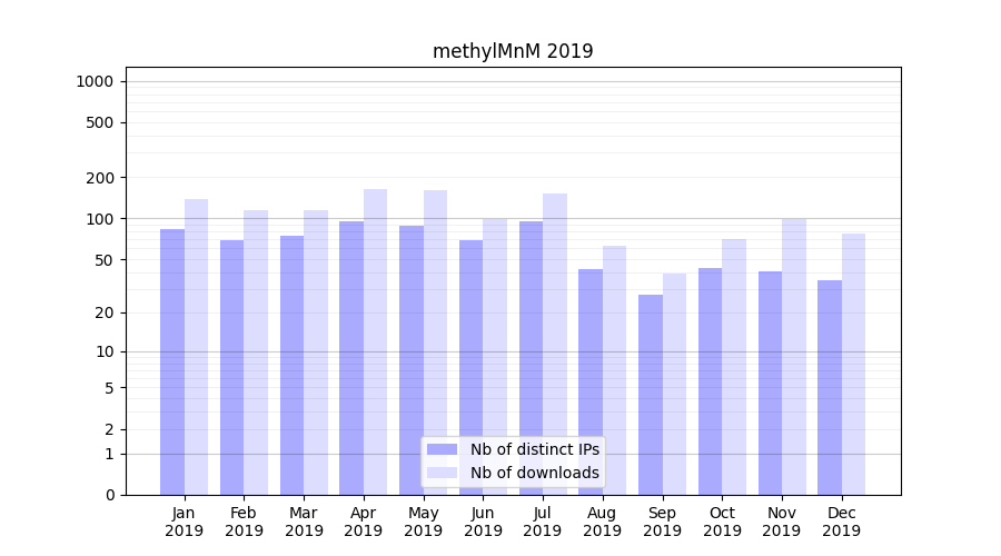Number of downloads for software package methylMnM, year by year, from 2025 back to 2014 (years with no downloads are omitted):
