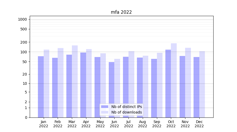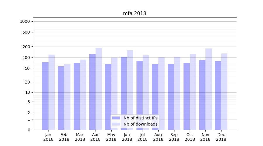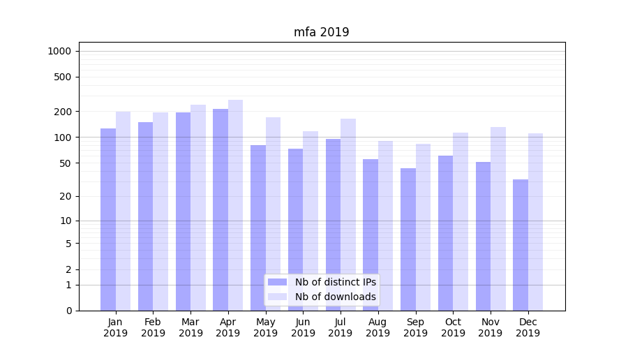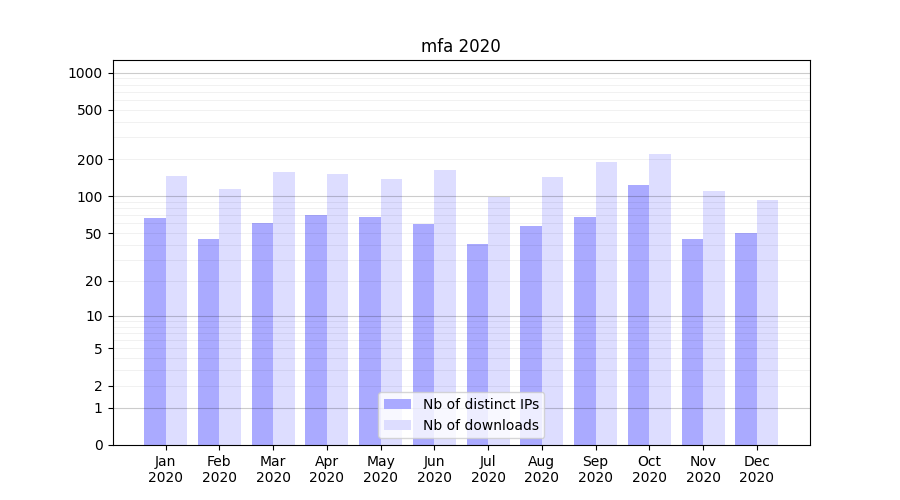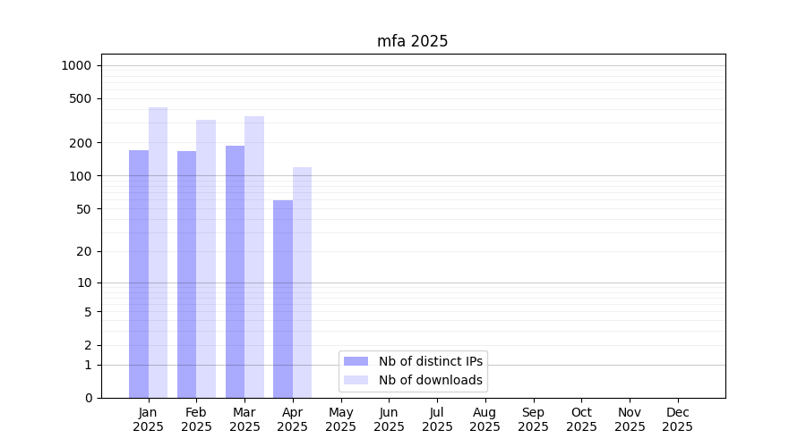 Number of downloads for software package mfa, year by year, from 2025 back to 2014 (years with no downloads are omitted):