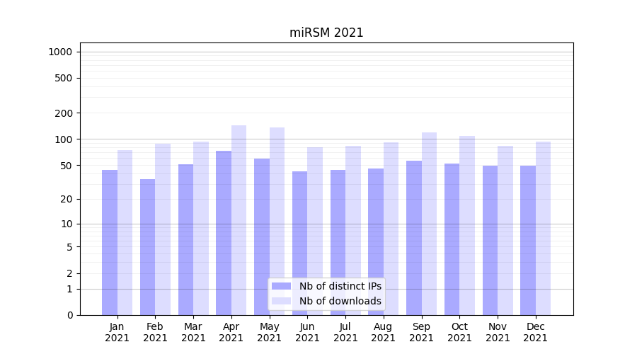 Number of downloads for software package miRSM, year by year, from 2025 back to 2014 (years with no downloads are omitted):