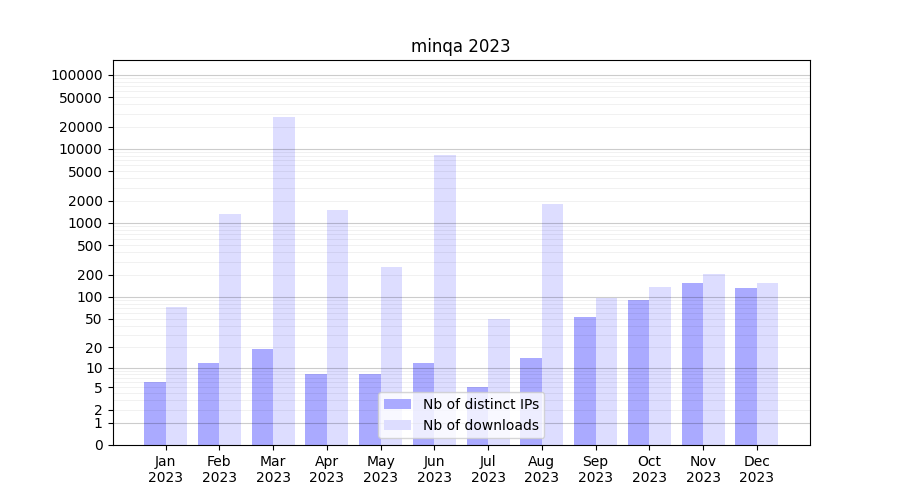 Number of downloads for software package minqa, year by year, from 2025 back to 2014 (years with no downloads are omitted):