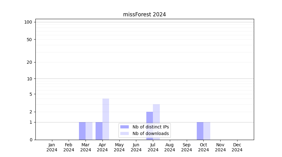 Number of downloads for software package missForest, year by year, from 2025 back to 2014 (years with no downloads are omitted):